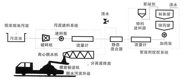 我公司制造的污泥離心脫水成套裝置的工藝流程圖如下(主要由六大部分組成):